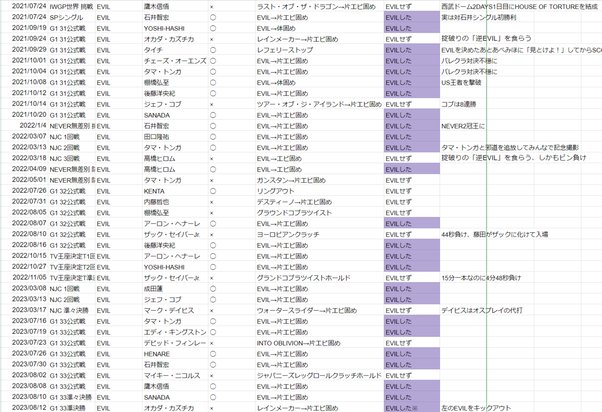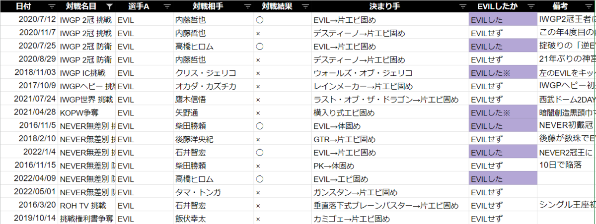今回も自作したEVIL選手のシングル戦績ビッグデータを用いて、10.9両国国技館で行われるIWGP世界ヘビー級王座戦の結果を占おうと思います。