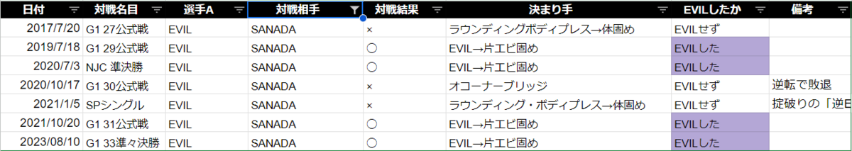 ■EVILの対SANADA戦績は「7戦4勝3敗」勝率57%